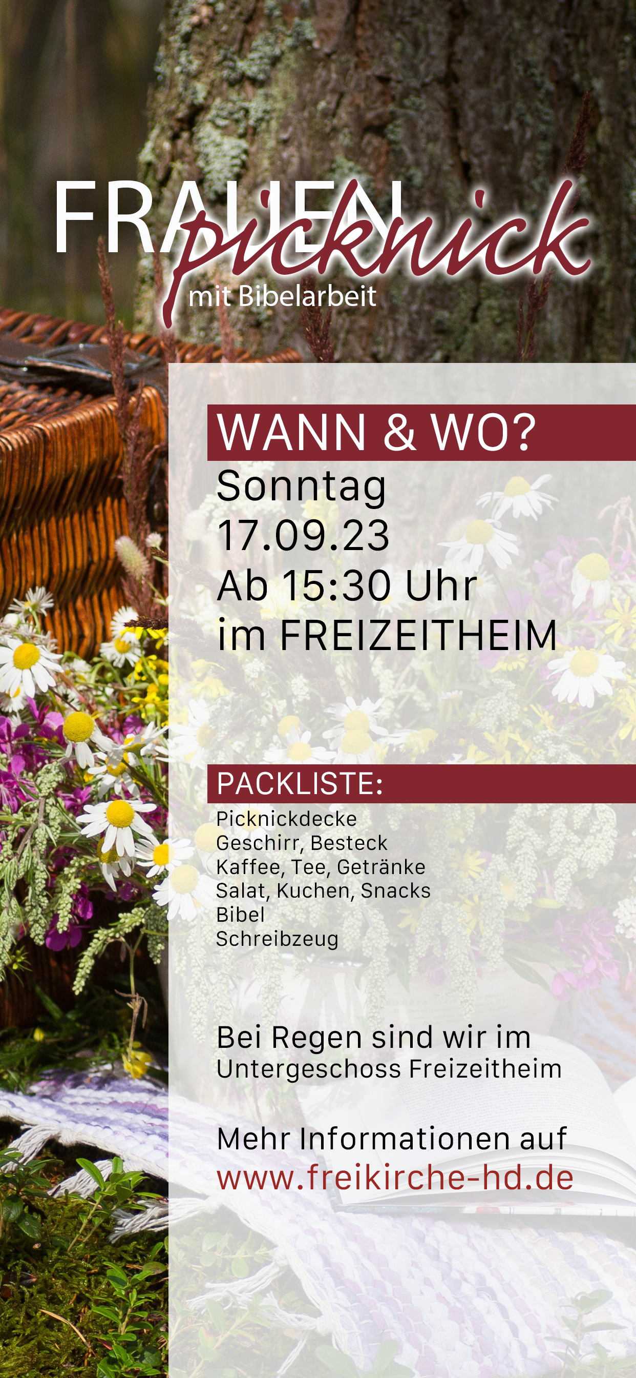 ganz herzlich laden wir euch am 17.09.2023, um 15:30 Uhr, in das Freizeitheim, zu einem FRAUENpicknick ein. Bitte Betet für gutes Wetter. Sollte es regnen, dürfen wir das Untergeschosse im Freizeitheim nutzen. Wir wollen zusammen in Römer 12 schauen also bring unbedingt deine Bibel und Schreibzeug mit. Ansonsten kannst du das mitbringen, was man so üblicherweise für ein Picknick braucht.