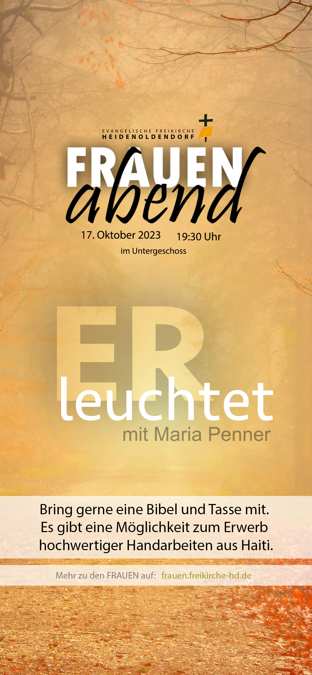 Wir haben Maria Penner als Rednerin eingeladen und Sie wird uns zu dem Thema ERleuchtet etwas weitergeben. Sei bei unserem letzten FRAUENabend in 2023 dabei!