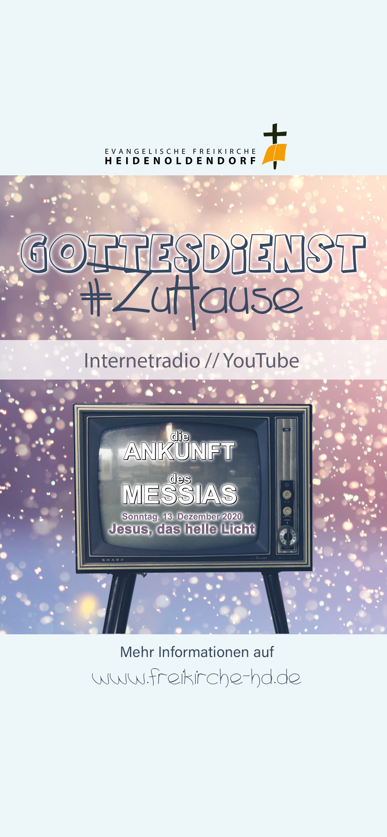 Am 27.12.2020, der erste Sonntag nach Weihnachten, möchten wir Sie einladen. Der Gottesdienst beginnt um 10:00 Uhr. Wir würden uns freuen, wenn Sie in irgendeiner Form dabei sind!