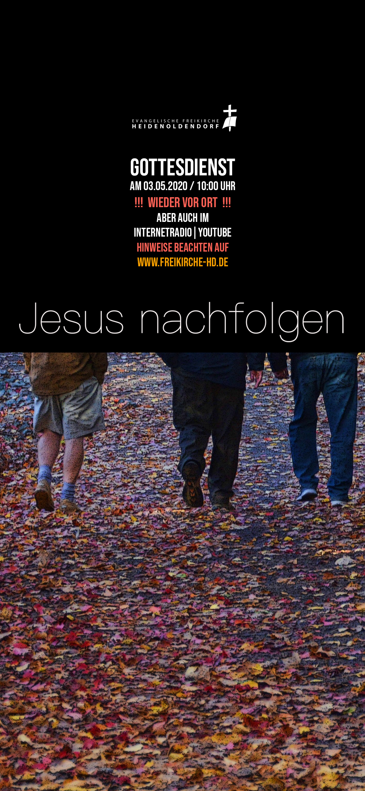 Wir laden diesen Sonntag zu unseren Gottesdienst(en) ein. Eines der Themen wird unter anderem sein "Jesus nachfolgen". Aber dieser Gottesdienst wird aus gegebenen Anlass noch besonderer! Denn er ist das erste Mal wieder mit Gottesdienstbesuchern. Wie, wann und wer? Dazu haben wir in einem seperaten Beitag ein paar Informationen und Hinweise zusammengefasst mit der bitte, diese vor einem Gottesdienstbesuch zu lesen. Wir werden aber auch weiterhin den Gottesdienst (um 10:00 Uhr) via Radio- oder Youtubestream streamen. Wie sie diesen verfolgen können, erfahren Sie hier. Auch wenn Sie die Übertragung verpasst haben, sie bleibt online verfügbar. Sie entscheiden, wann für Sie die Veranstaltung beginnt.