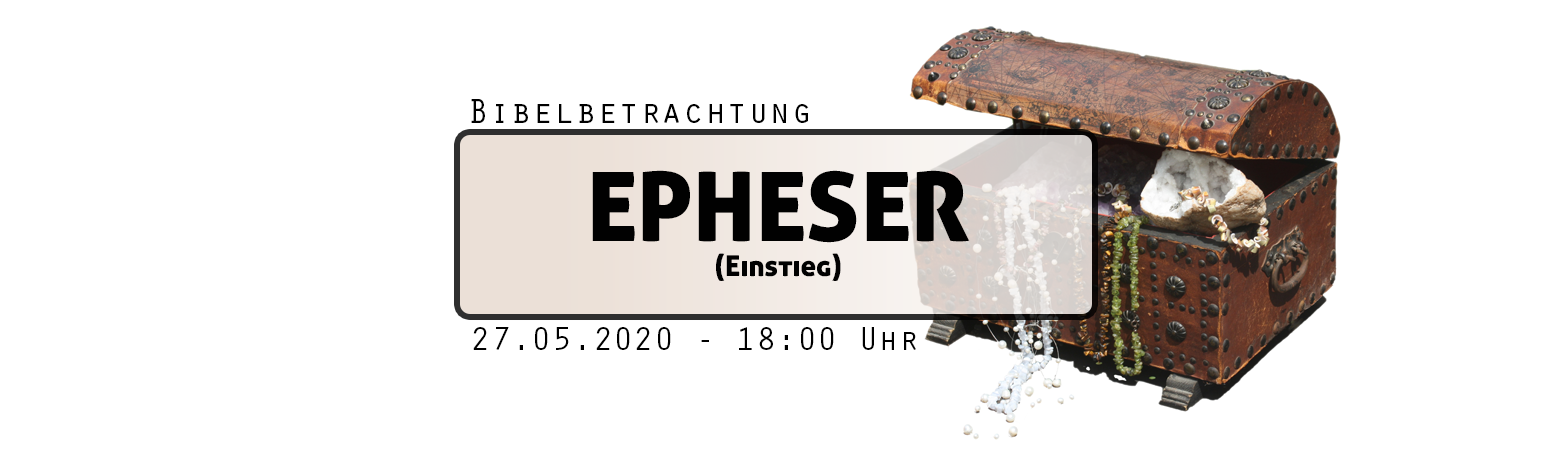 Ab nächste Woche starten wir im Rahmen der Bibelbetrachtungen ein neues Buch - Eine perfekte Möglichkeit einzusteigen und von Beginn an dabei zu sein! Wir starten am Mittwoch, den 27.05.2020 um 18:00 Uhr. Wir laden herzlich dazu ein, planen Sie sich diesen Termin ein und kommen Sie in unsere Bibelbetrachtung. Worum es geht? Wir empfehlen das anlesen bzw. durchlesen - es ist nur ein kurzes Buch der Bibel: Epheser (Link leitet Sie weiter auf bibleserver.com)