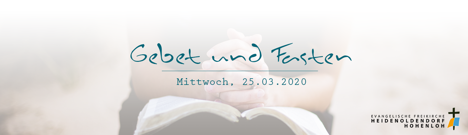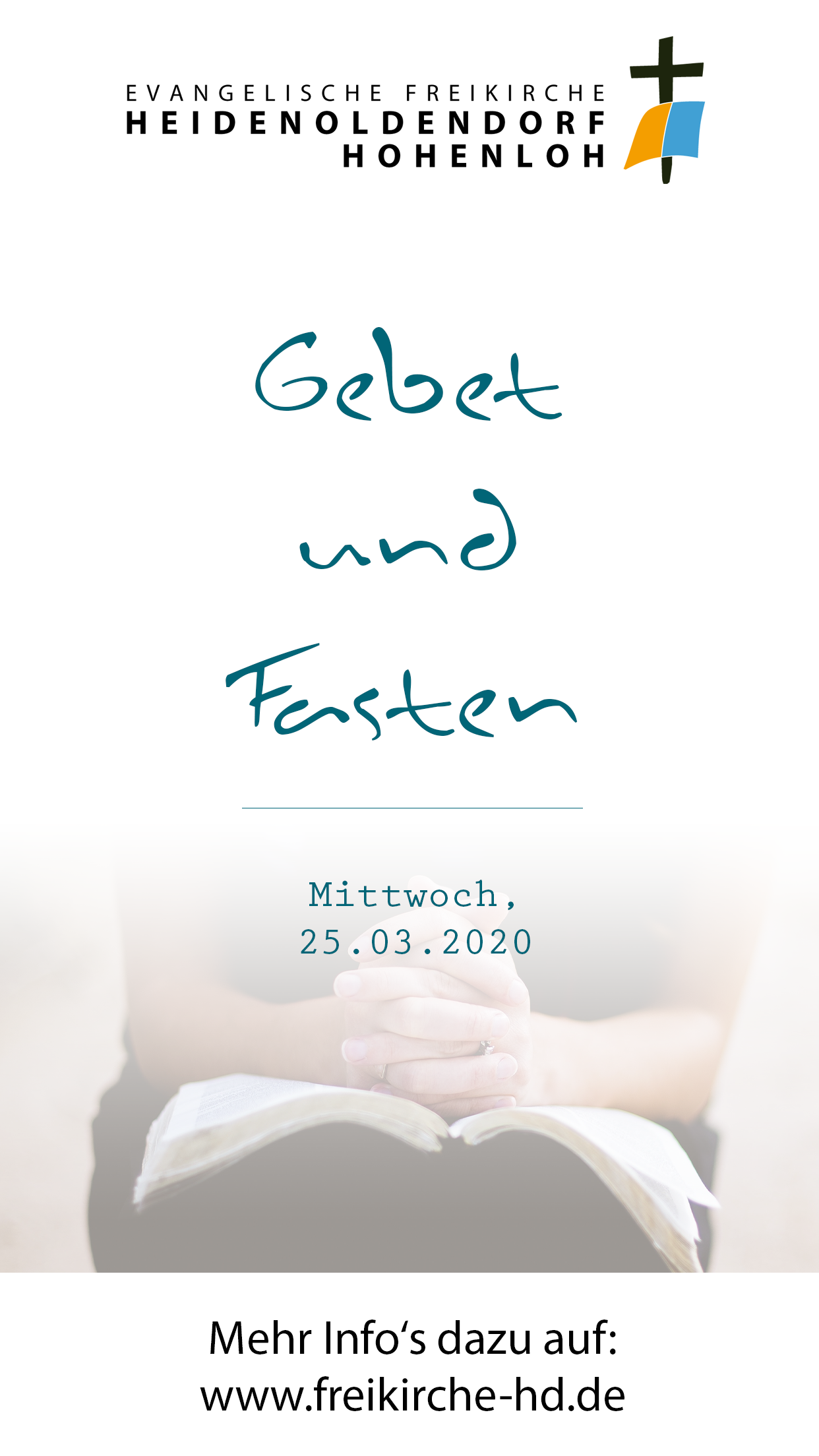 Am Mittwoch, den 25.03.2020 möchten wir gemeinsam mit der Ev. Freikirche in Hohenloh den ganzen Tag zu "Gebet und Fasten" aufrufen! Macht mit!