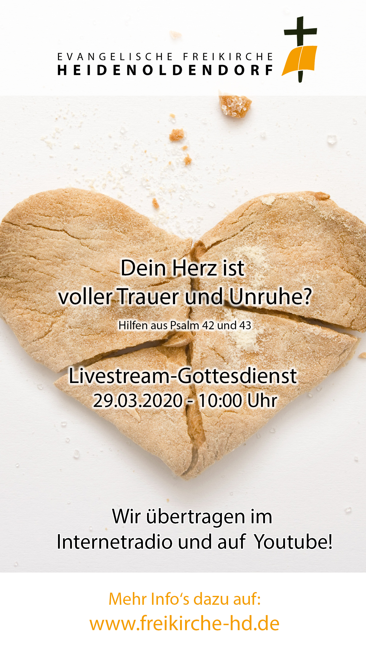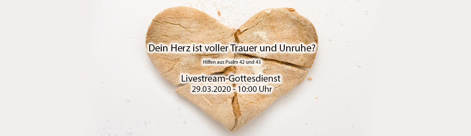Dein Herz ist voller Trauer und Unruhe? - Auch diesen Sonntag möchten wir den Sonntags-Gottesdienst mit ihnen trotz der aktuellen Situation gemeinsam feiern. Wir werden auch diesen Sonntag uns mit einem Thema beschäftigen und es wird etwas für unsere Kleinen geben. Wir möchten auch wieder gemeinsam Singen. Verfolgen und dabeisein können Sie diesen Gottesdienst via Radio- oder Youtubestream. Wie, erfahren Sie hier.