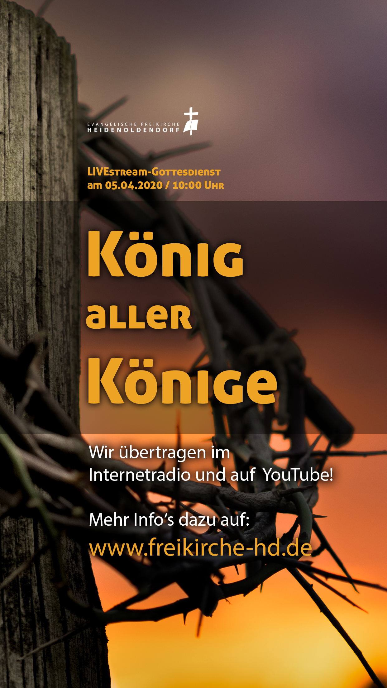 König aller Könige - Auch diesen Sonntag möchten wir den Sonntags-Gottesdienst mit ihnen trotz der aktuellen Situation gemeinsam feiern. Wir werden auch diesen Sonntag uns mit einem Thema beschäftigen und es wird etwas für unsere Kleinen geben. Wir möchten auch wieder gemeinsam Singen. Verfolgen und dabeisein können Sie diesen Gottesdienst via Radio- oder Youtubestream. Wie, erfahren Sie hier.