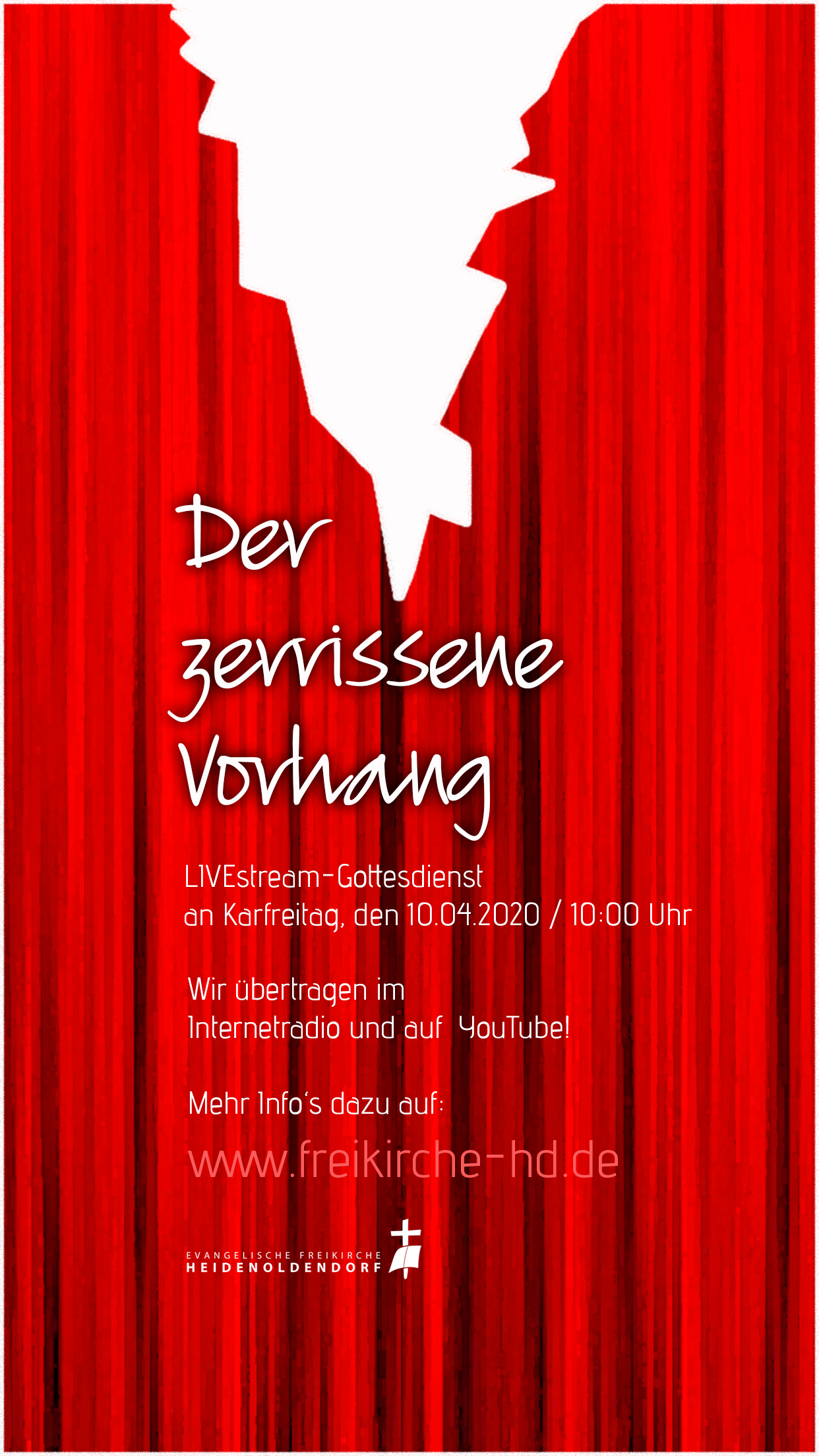 Uns taten schon die vergangenen Sonntage ohne Gottesdienst-Besuch weh - doch Ostern zuhause zu verbringen - DAS tun uns noch mehr weh! Trotzdem möchten wir versuchen Ostern, in diesem Fall Karfreitag, trotz dieser aktuellen Situation mit ihnen gemeinsam zu feiern. Wir möchten über ein zerissenen Vorhang reden und auch wieder gemeinsam Singen. Verfolgen und dabeisein können Sie diesen Gottesdienst via Radio- oder Youtubestream. Wie, erfahren Sie hier.