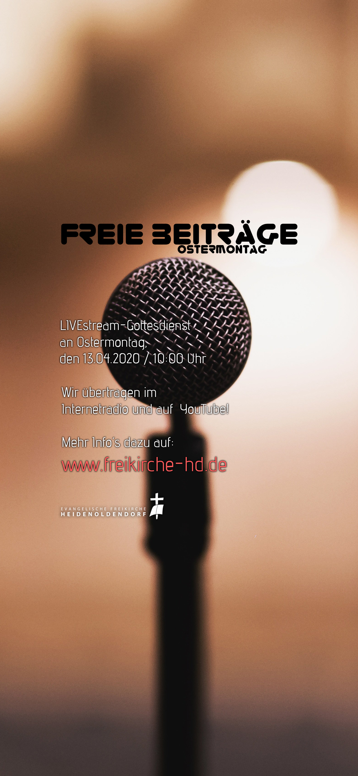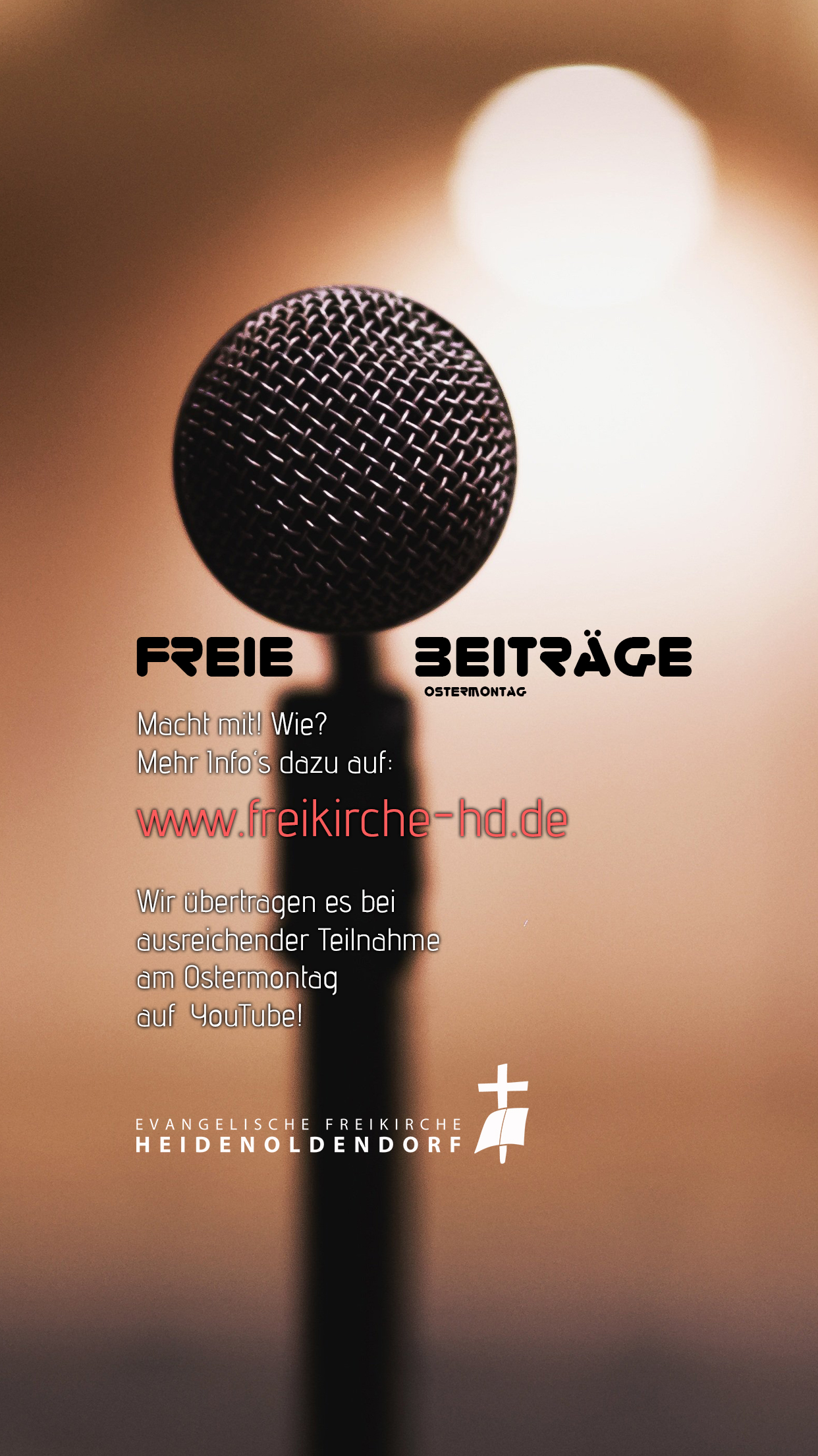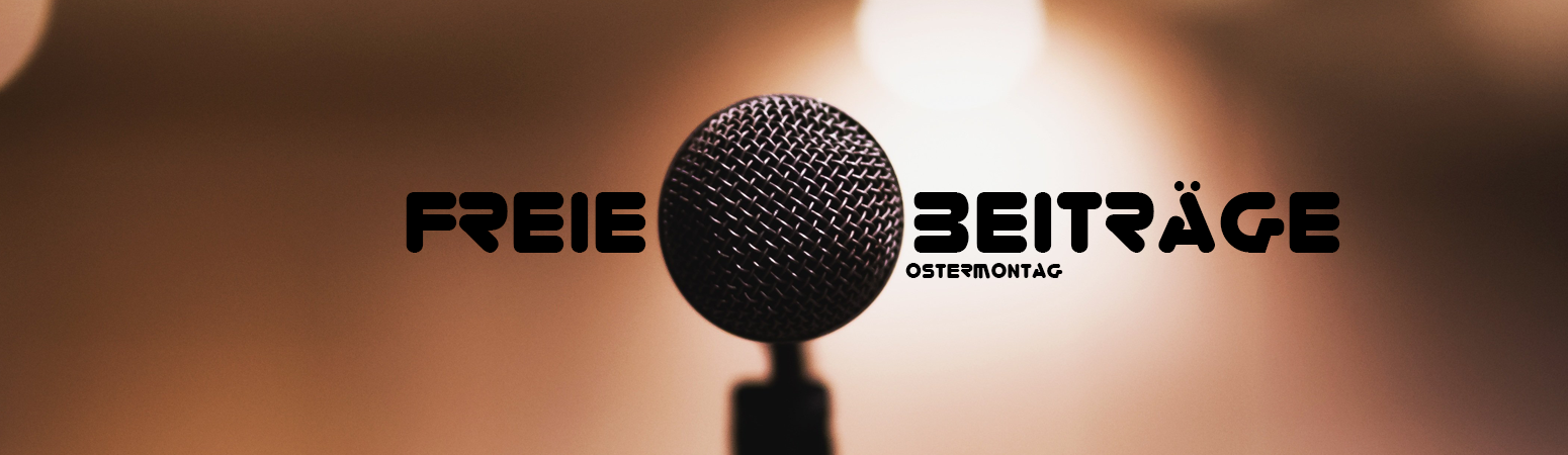Wir wollen euch aufrufen, freie Beiträge (passend zu Ostern) an uns zu senden, z.B. ein Lied, ein Musikstück, ein Gedicht oder ganz was anderes. Nehmt zuhause etwas auf und sendet es an Diese E-Mail-Adresse ist vor Spambots geschützt! Zur Anzeige muss JavaScript eingeschaltet sein!.