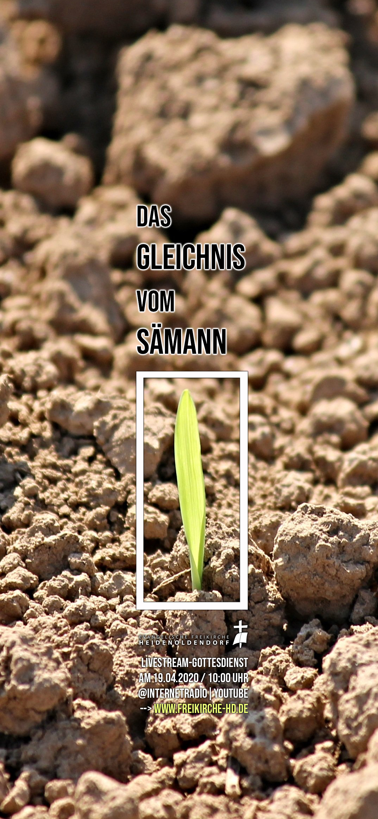 In der Bibel in Matthäus 13, 1-9 wird uns eine Begebenheit erzählt, in der Jesus zu vielen Menschen am Ufer eines See's spricht. Er erzählt Das Gleichnis vom Sämann. Das wird unter anderem unser Thema am Sonntag sein. Es wird natürlich etwas für unsere Kleinen geben und wir möchten auch wieder gemeinsam Singen. Wir würden uns freuen, wenn Sie dabeisein können und diesen Gottesdienst via Radio- oder Youtubestream verfolgen. Wie, erfahren Sie hier.
